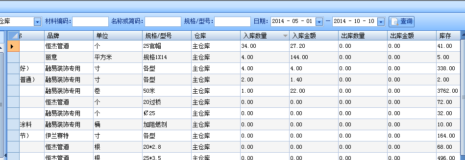 庫存查看按一個時間范圍查詢出入庫數(shù)量,將沒有出入庫數(shù)量的材料都顯示出來。