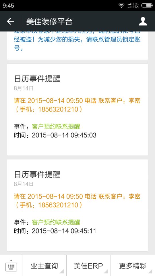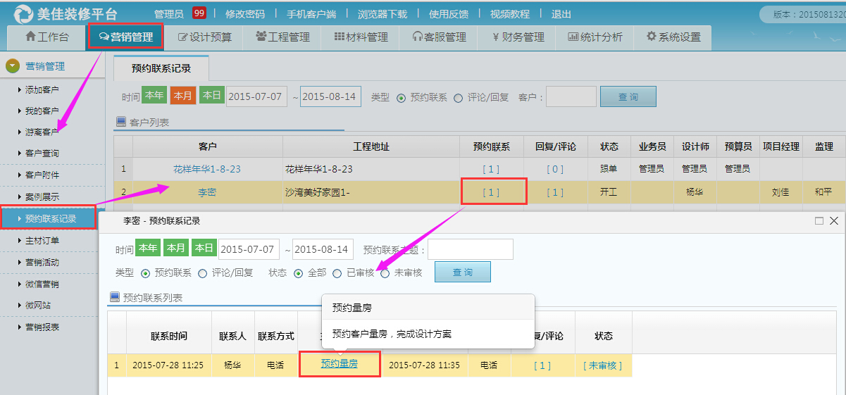 家裝業(yè)務(wù)員、設(shè)計(jì)師們注意啦!現(xiàn)在使用美佳裝修管理平臺(tái)或手機(jī)APP對(duì)客戶預(yù)約管理,系統(tǒng)會(huì)通過(guò)微信、短信自動(dòng)提醒、催促你跟客戶聯(lián)系。并且直到你在系統(tǒng)中添加跟進(jìn)情況后,系統(tǒng)才會(huì)停止提示。