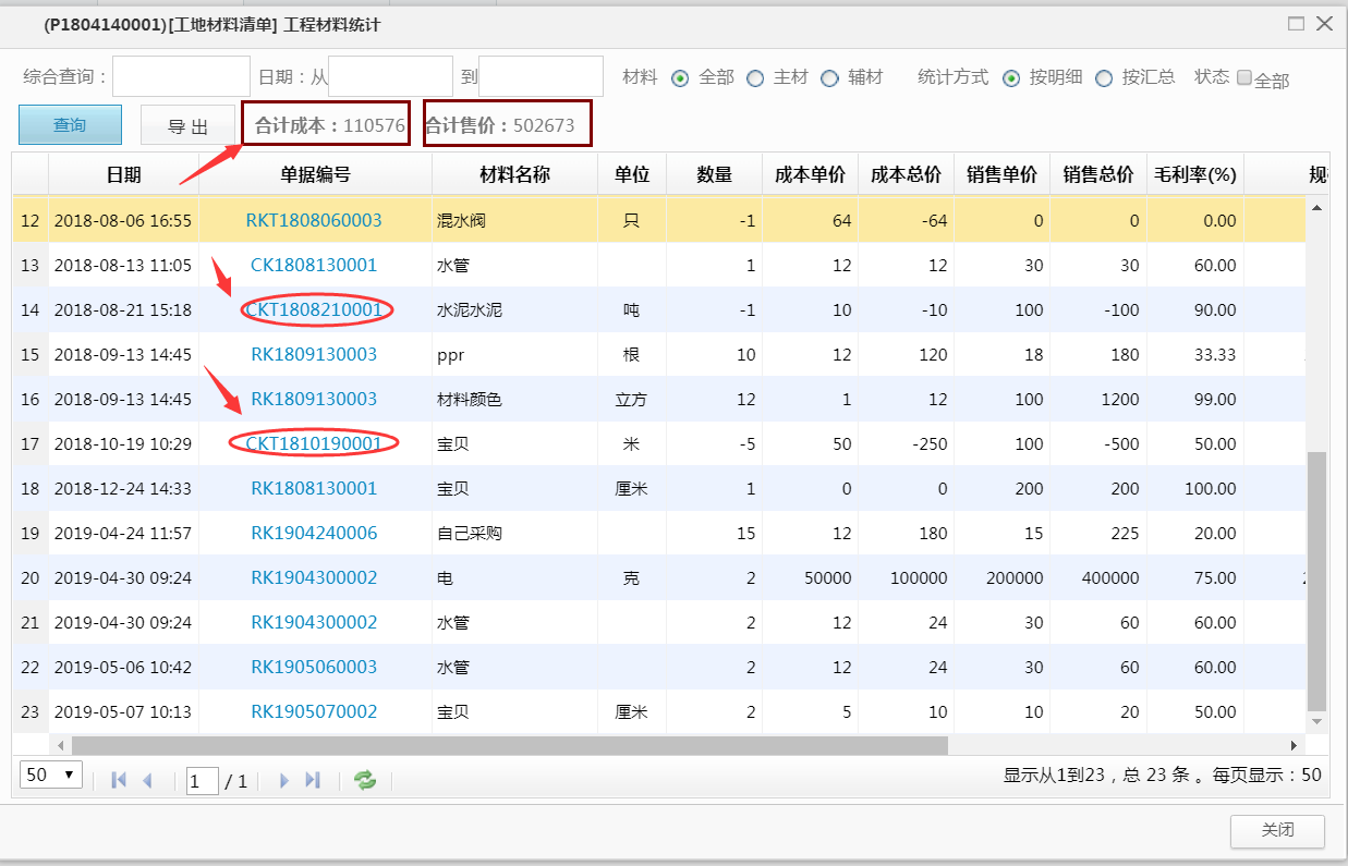 2、工地材料清單可查看所有用料數量及金額,另外也將退貨材料一一顯示,自動計算成本總價及銷售單價,針對每個工程的具體材料情況作出統計分析