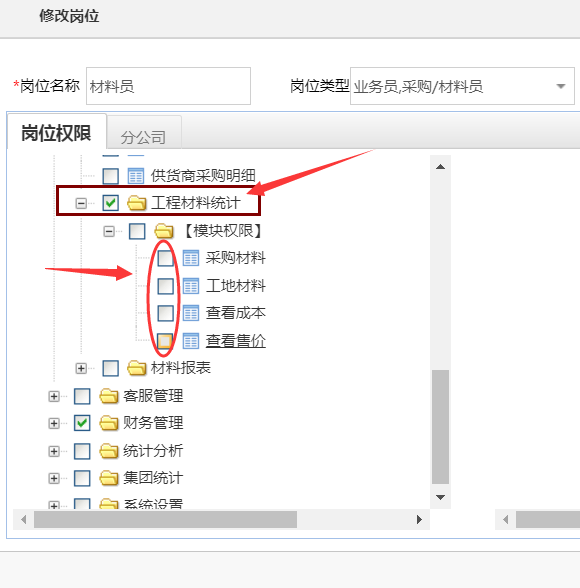 工程材料清單將客戶的采購清單和工地用料清單都統計在內,采購材料、工地材料、成本價、銷售價均可自定義決定是否開通給相應的崗位,這樣給決策者對于價格的保密性增加了更多的選擇空間,具體操作如下所示