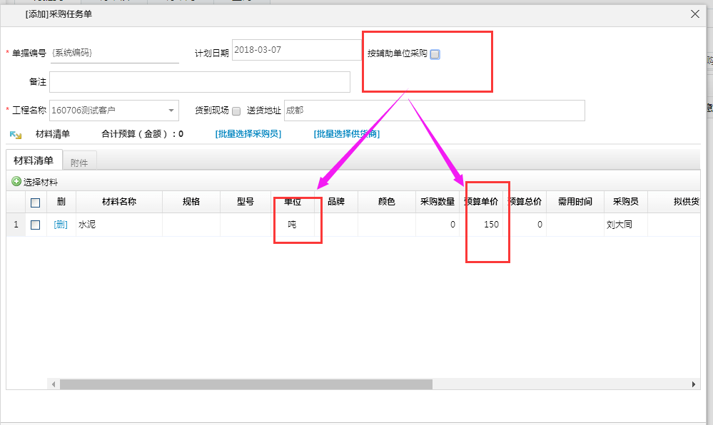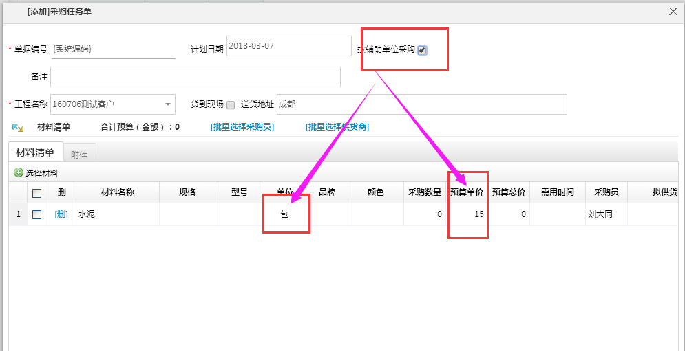 裝修公司在做材料采購(gòu)時(shí)可能會(huì)采購(gòu)大批量的材料,但是就具體某個(gè)工程來(lái)說(shuō)所需的材料只是少量的需求,這樣就產(chǎn)生了價(jià)格偏差,為解決此類問(wèn)題,美佳ERP技術(shù)部近期開發(fā)增加輔助單位,例如:公司一次性采購(gòu)水泥 1 噸,報(bào)價(jià)為150元/噸,某個(gè)工程所需水泥1包,那么系統(tǒng)自動(dòng)將價(jià)格調(diào)整為15元/包。