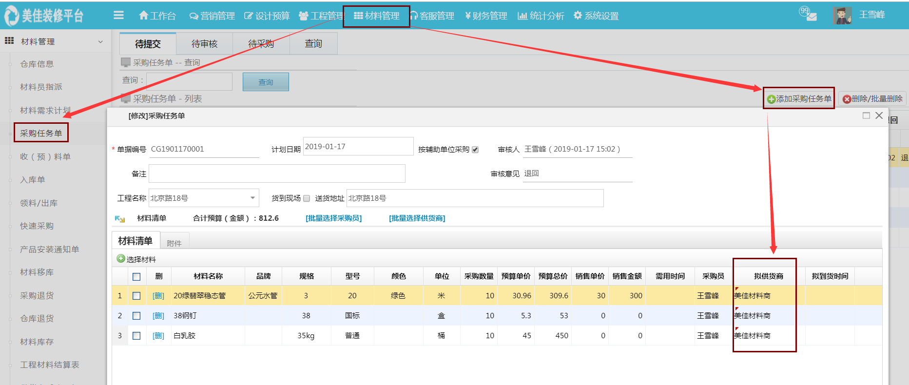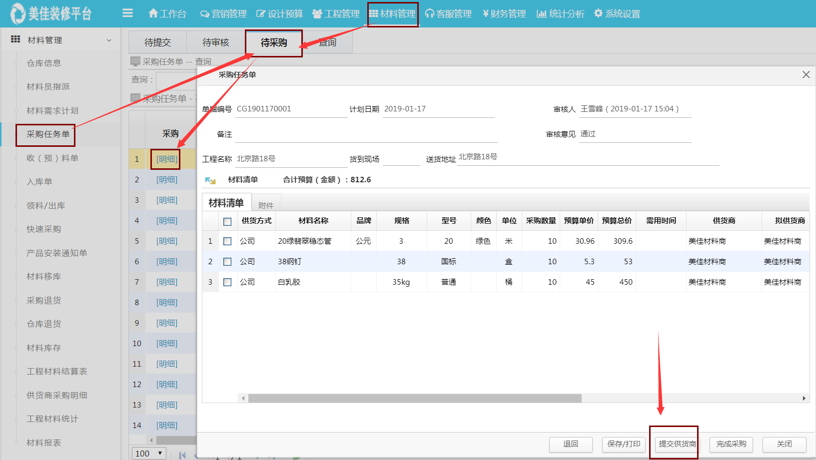 一:首先針對裝修公司而言,我們直接通過采購任務(wù)單完成對供貨商的下單操作: