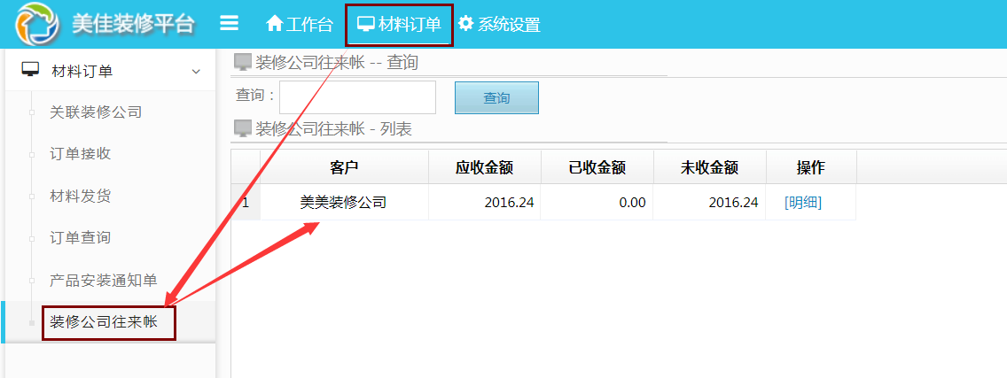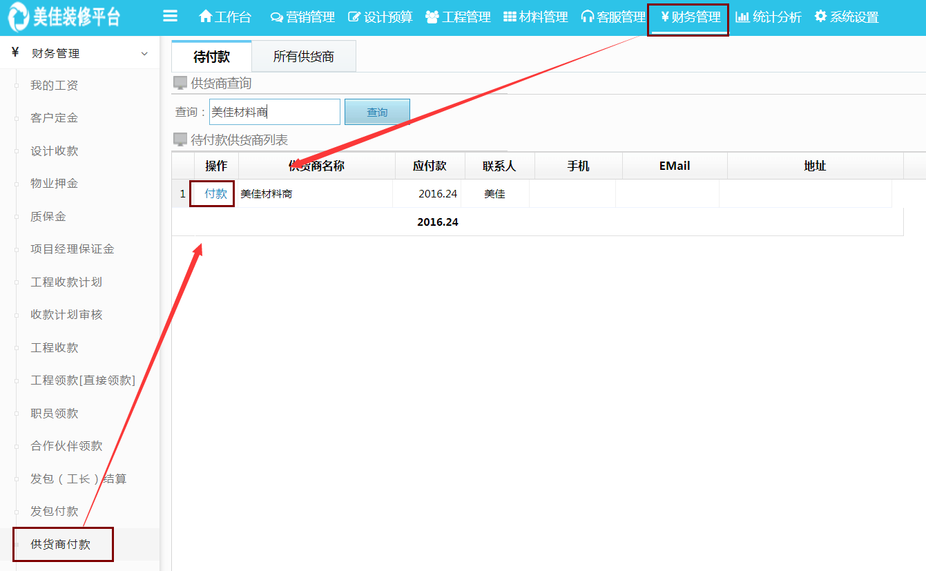 四:材料款結(jié)算系統(tǒng)會自動計算出相應(yīng)的金額,裝飾公司通過財務(wù)管理--供貨商代付款進行查詢及結(jié)算,供貨商可通過裝修公司往來賬查詢材料款具體金額。