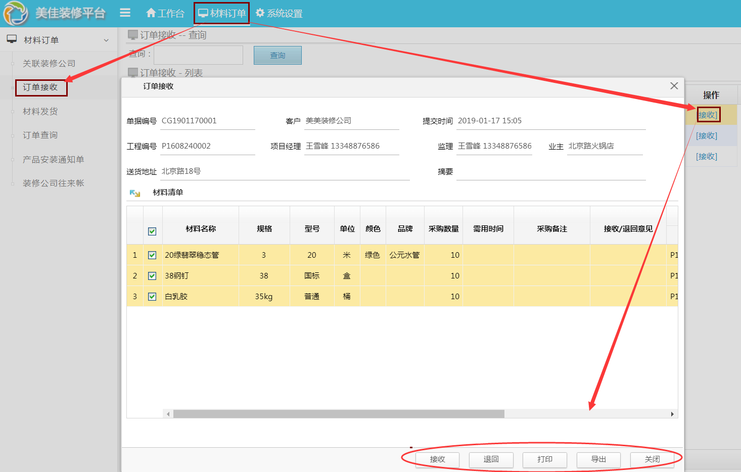 二:供貨商可直接通過電腦PC端或是手機APP完成訂單的接收,或是針對裝修公司提交的訂單進行相應(yīng)的篩選,可接收也可退回。如下所示: