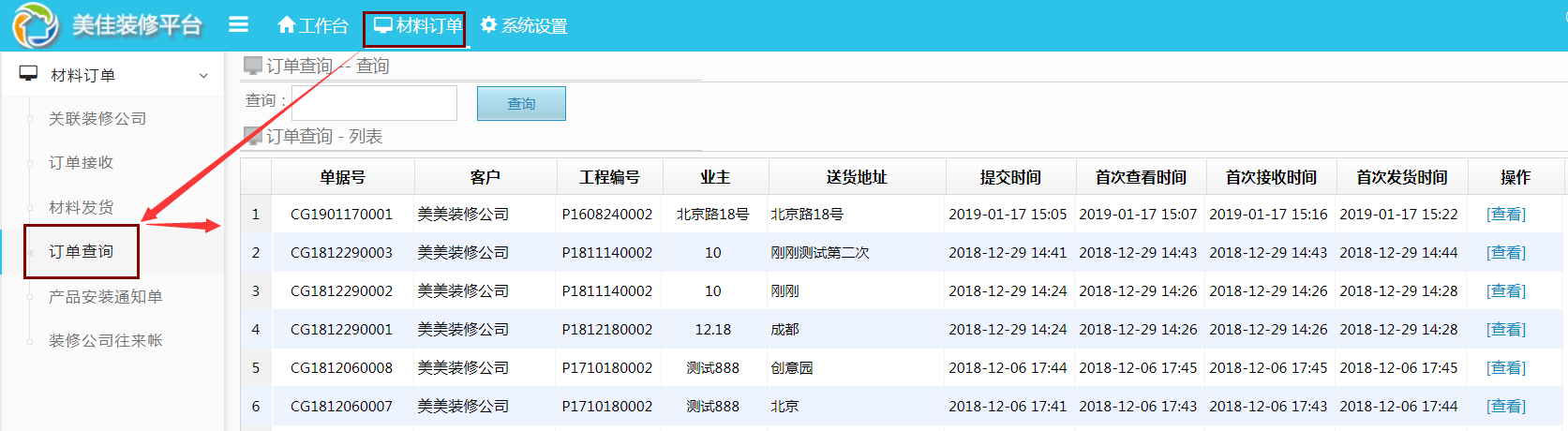 三:當(dāng)材料準備妥當(dāng)可在材料發(fā)貨界面將訂單完成發(fā)貨,裝修公司即可完成材料收貨及財務(wù)稽核等。屆時材料從下單到接單及發(fā)貨整個流程完成數(shù)據(jù)沉淀,隨時可進行查閱。