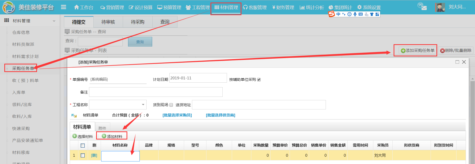 第二步驟:通過【材料管理】--【采購任務單】--【添加材料】完成自定義材料的添加
