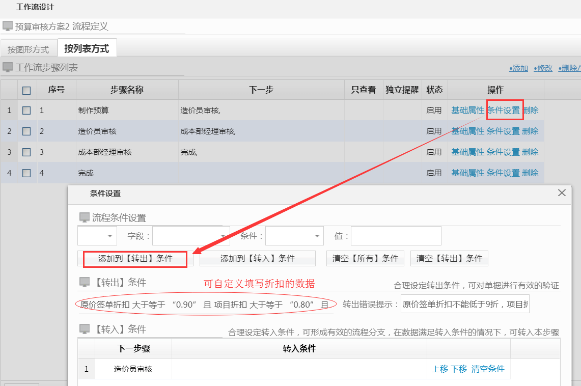 預(yù)算審核工作流增加簽單金額及其他數(shù)據(jù)打折率限制,如果超出當(dāng)前設(shè)置的折扣則不能提交