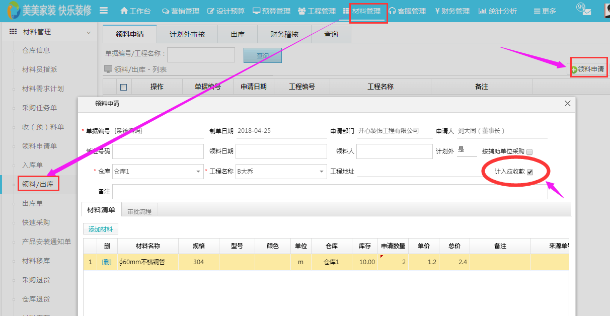 出庫單關聯(lián)到工程收款是為大家解決做預算時沒有將有關材料計入到預算報表,后期也沒有做增減預算而產(chǎn)生的額外材料費用的收取情況。