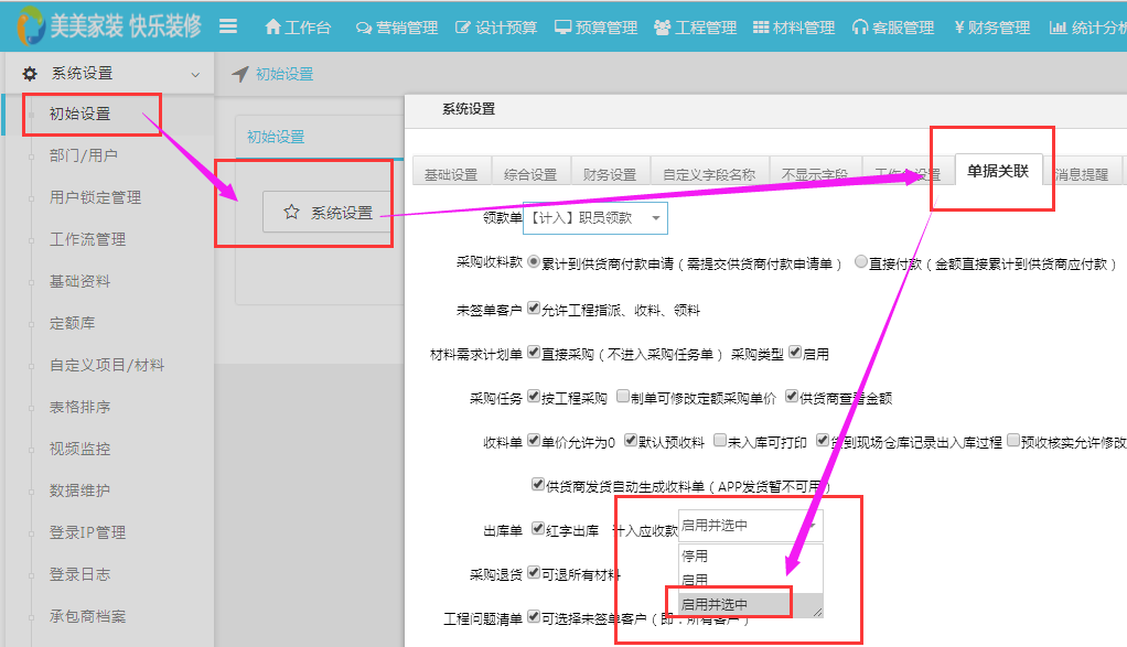 依次點擊:**系統(tǒng)設置---初始設置---系統(tǒng)設置---單據(jù)關聯(lián)**
