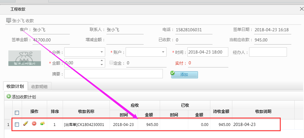 工程收款:計入應收款的出庫單流程完成后在,對應客戶的工程收款中生成待收款信息