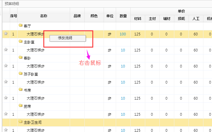 2、進(jìn)入【設(shè)計預(yù)算】---選擇一個做好的工程預(yù)算鼠標(biāo)右擊一個項目即可進(jìn)行說明修改。