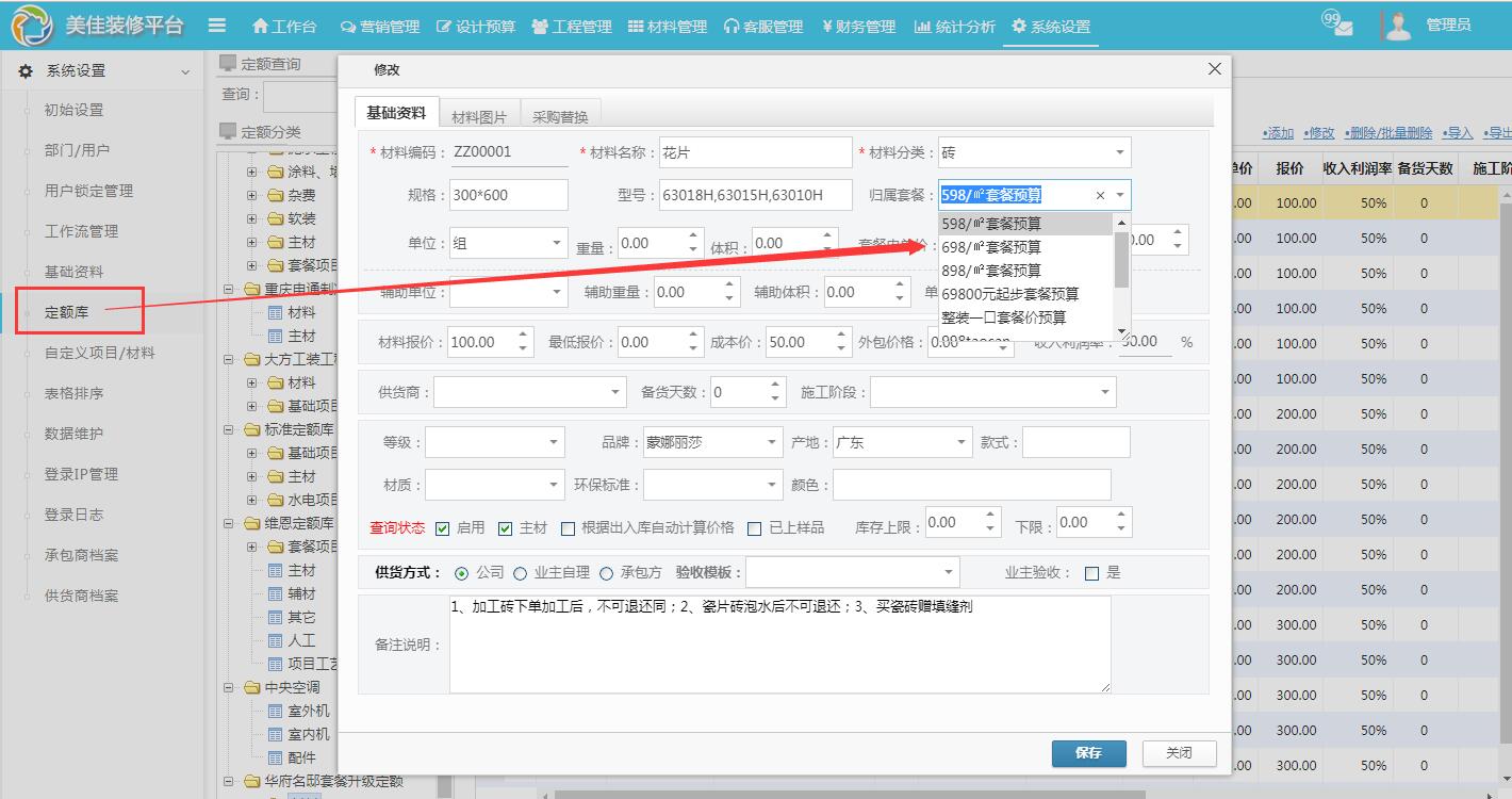 美佳裝修管理軟件,專業概預算軟件,根據客戶反饋需求新增套餐升級啟用定額庫,此功能只需在定額庫中設置材料對應不同套餐價系的升級價格,那么設計師、預算員在為客戶制作預算報價時,便可按客戶意愿不同價系的套餐材料進行升級且自動計算出升級差價。