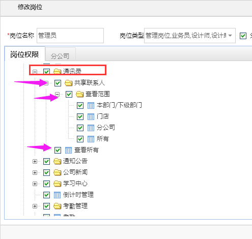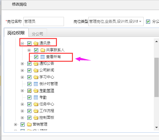 依次點擊系統(tǒng)設(shè)置---部門/用戶---崗位管理---工作臺---通訊錄---勾選所有