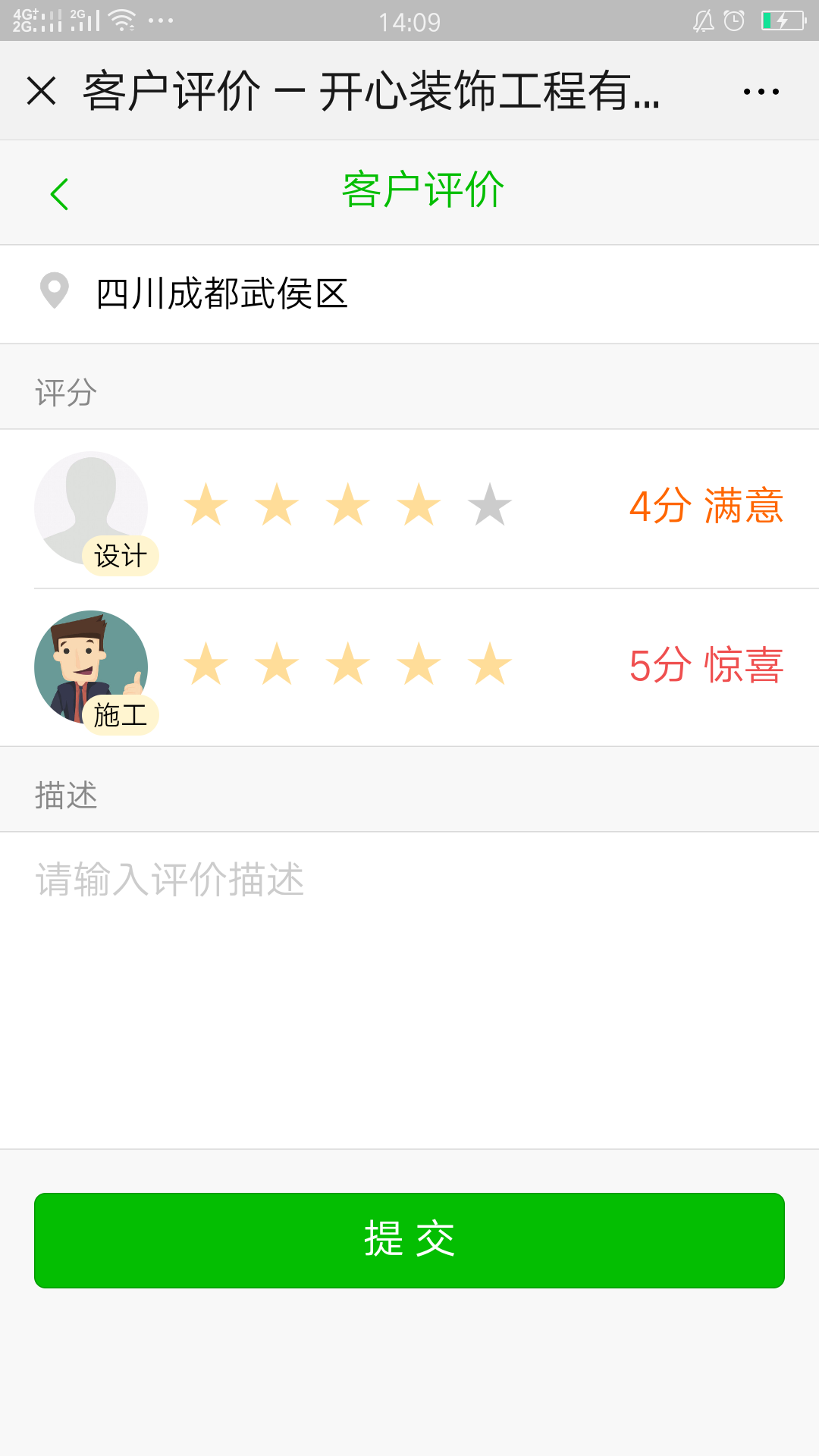 微信客戶端,在業主微信端,業主通過“裝飾管控公眾號”點擊業主中心“客戶評價”直接針對設計和施工分別打分,同時還可補充詳細的描述。