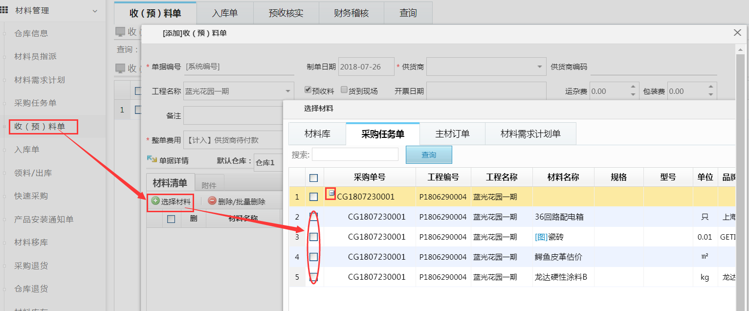 依次點(diǎn)擊:材料管理---收預(yù)料單---添加材料(采購(gòu)任務(wù)單)