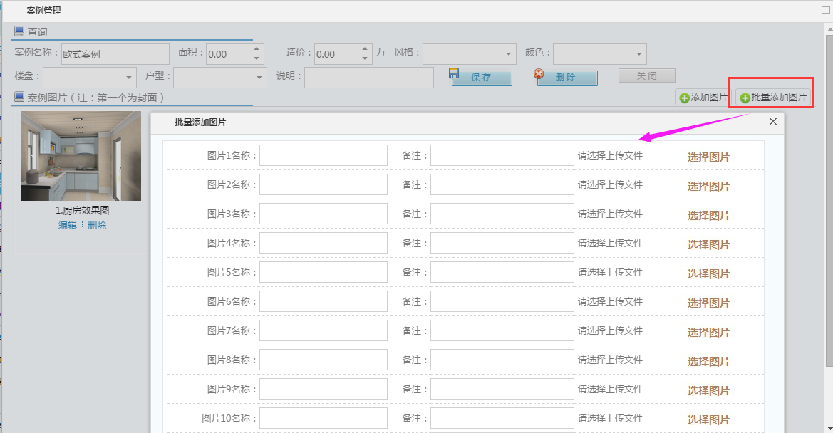 案例庫用于管理公司成功案例,優化后一次性可批量上傳多張圖片,大大提高了工作效率。如下圖所示: