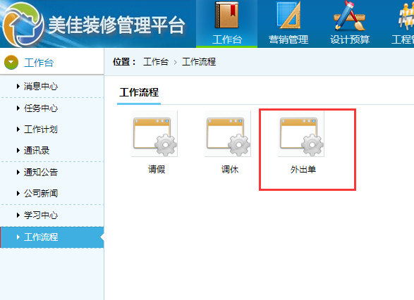 美佳裝飾管理軟件工作流程新增美佳裝飾管理軟件工作流程模塊新增外出單,方便記錄外出人員的外出和返回時間,查詢一段時間內(nèi)的外出記錄。審批流程可在系統(tǒng)設(shè)置—工作流管理中自行設(shè)置。