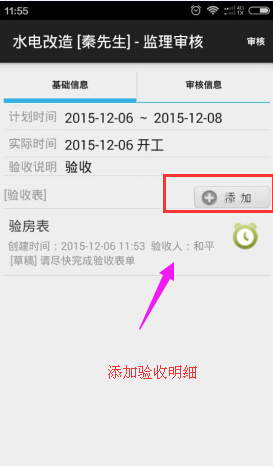 美佳裝飾管理軟件 新增:項目驗收可根據固定驗收模板驗收,方便監理、業主驗收項目有驗收依據和標準,目前安卓手機端已經上線該功能。驗收時可通過手機端添加驗收模板,參考驗收標準和要求。