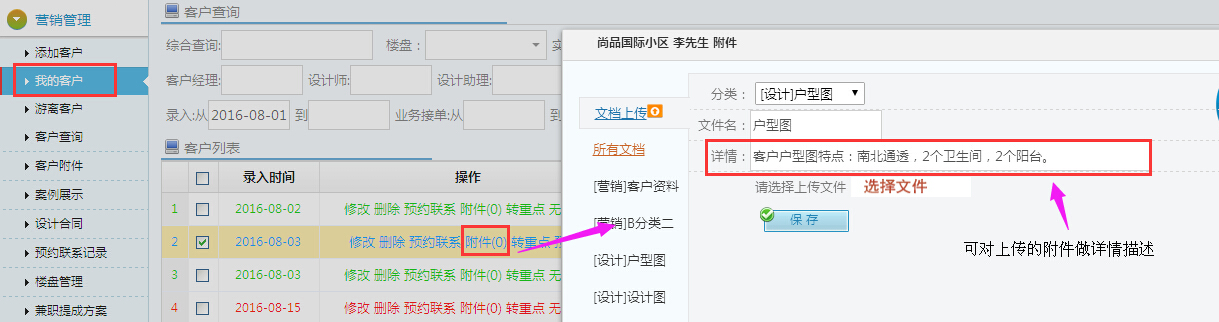 為方便裝飾公司業務員,設計師分析客戶需求,共享客戶需求,本次新增:上傳附件可以填寫詳細說明。如下圖所示: