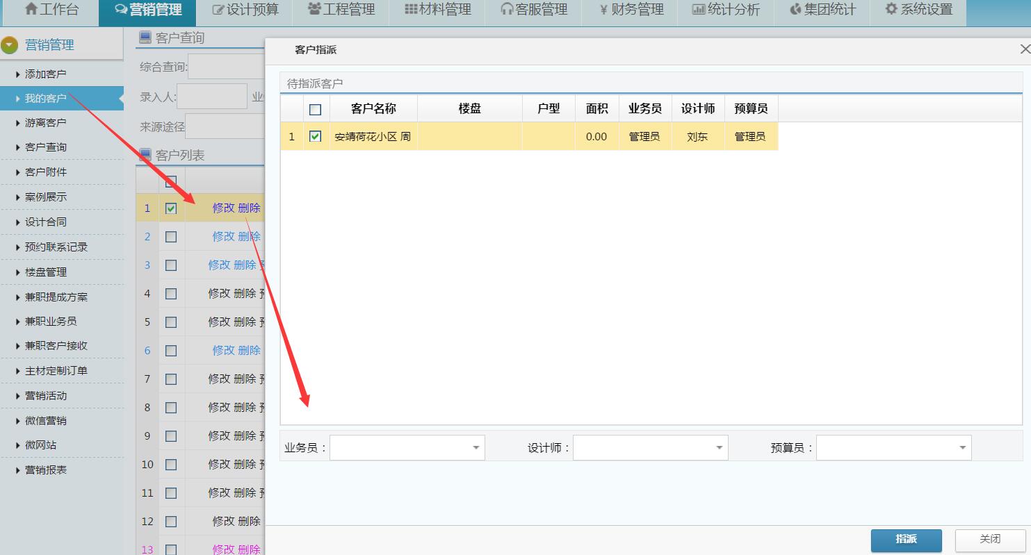 美佳裝飾管理軟件,最智能的裝修管理軟件,客戶指派新增員工簽單率排名功能。即業務員、設計師、預算員等崗位人員,在分配客戶的時候,管理者可查看到相關人員的客戶情況及簽單情況。有了此功能后,管理人員即可對成單率較高的人員多分配新客戶,對于鎖定時間內的人員將不能分配新客戶,起到最大限度的利用好客戶資源,促進簽單。操作如下: