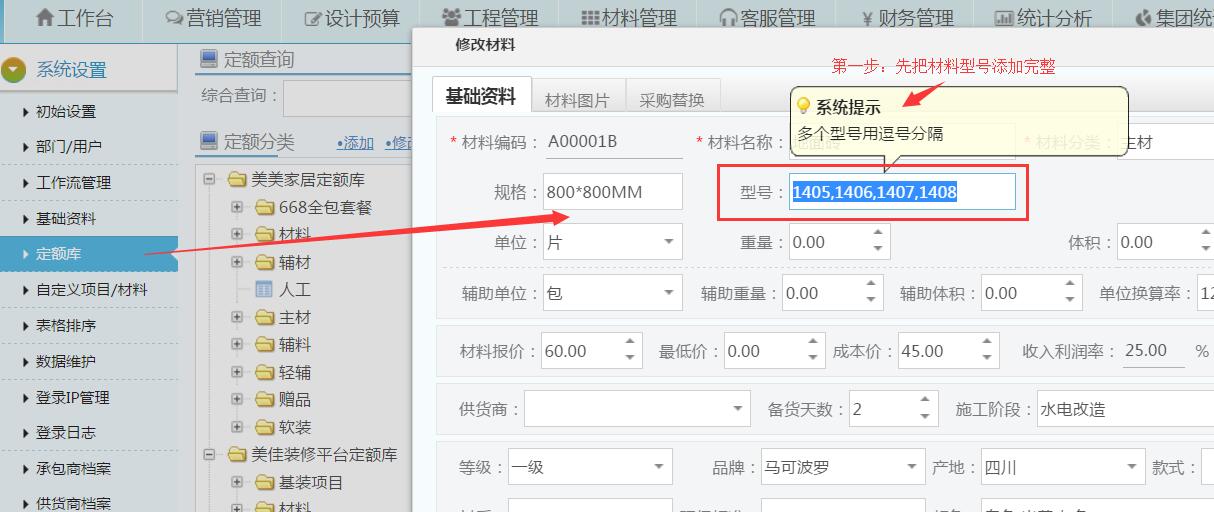 美佳裝飾管理軟件,為滿足裝修公司各種須求,裝修平臺不斷在升級。繼同種材料多種顏色的功能上線之后現新增功能:同種材料可支持多種型號。此功能開通后,裝修公司管理材料可再細化,管理一種材料多種型號。便于給客戶做預算報價時,按客戶需求選擇對應的材料型號。