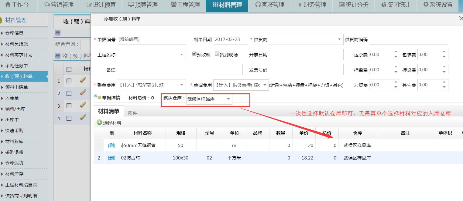 3、收料單,增加?默認倉庫,選擇了默認倉庫則整張收料單中材料默認入庫到此倉庫,可支持單個材料倉庫修改。
